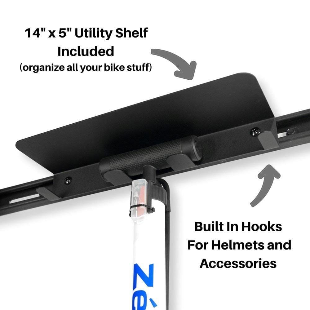 - VERSATILE - The 2-Bike Wall Mounted Bike Rack includes a hook/shelf combo to hang helmets and other accessories. No other wall mount bike rack system gives you this much flexibility.